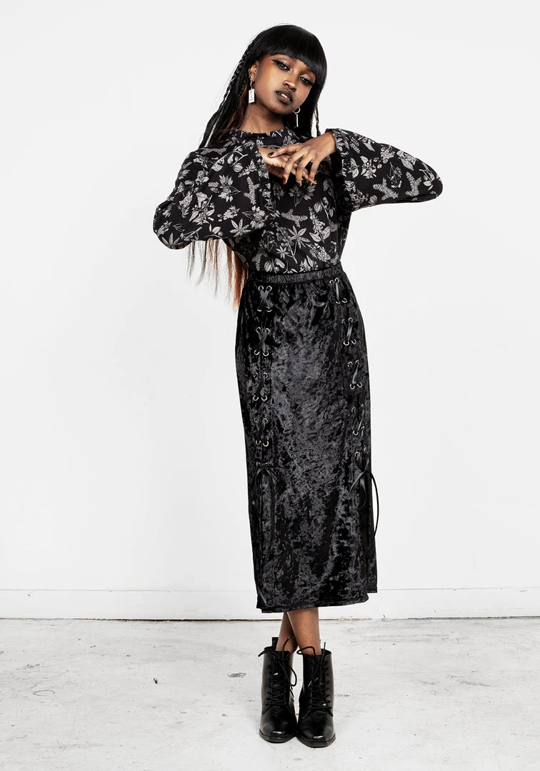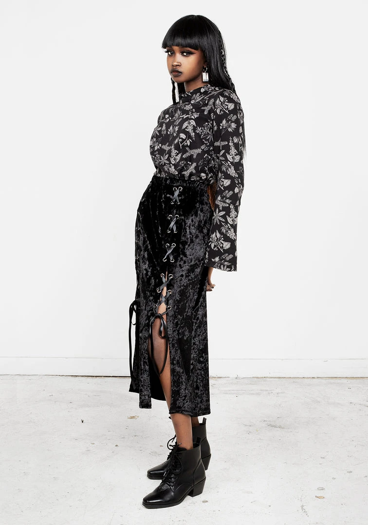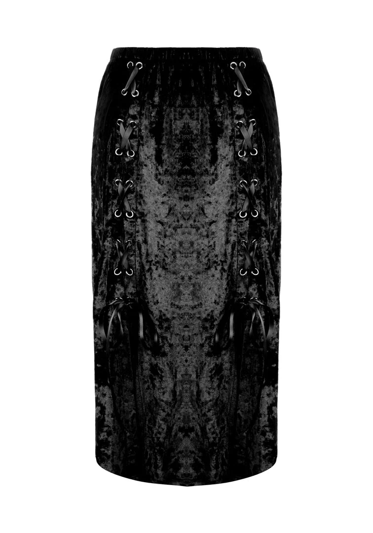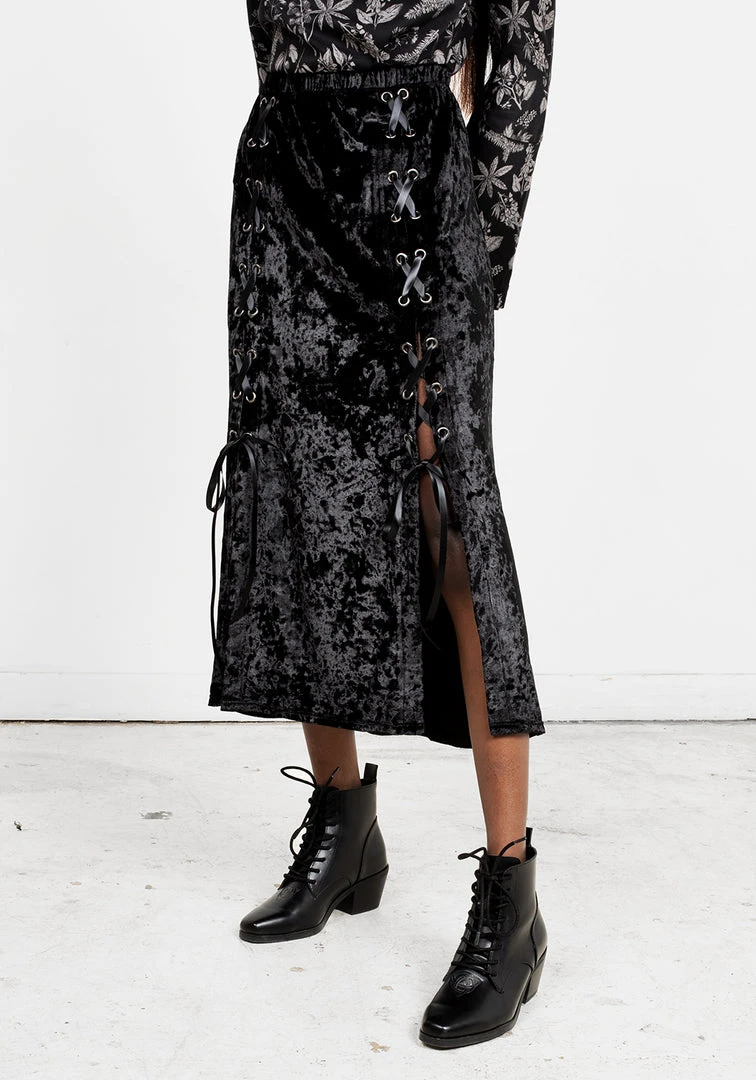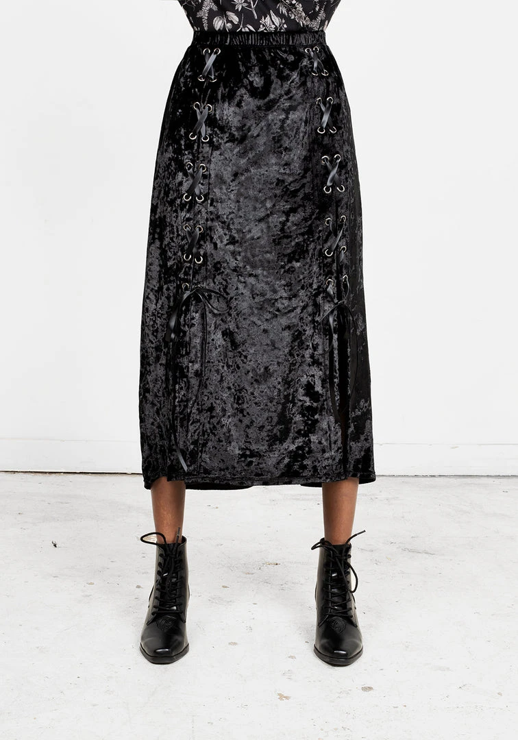 โฆย Lace-up midi skirt in black velvet