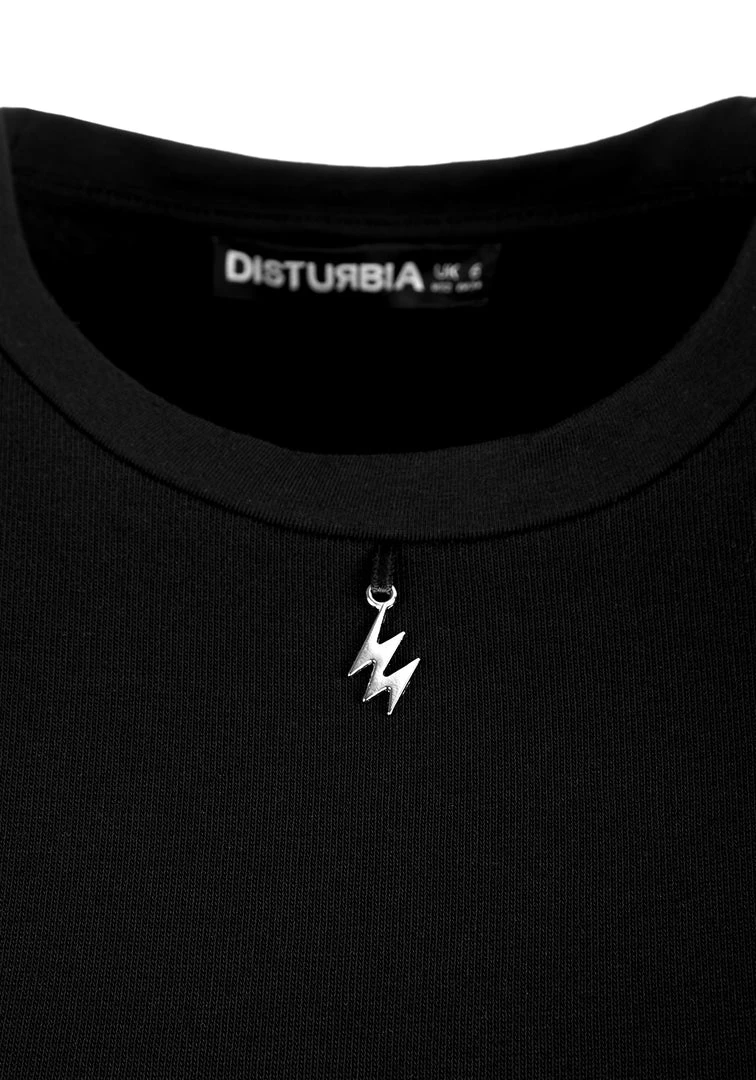 โงย Silver metal lightning charm hangs from crew neck