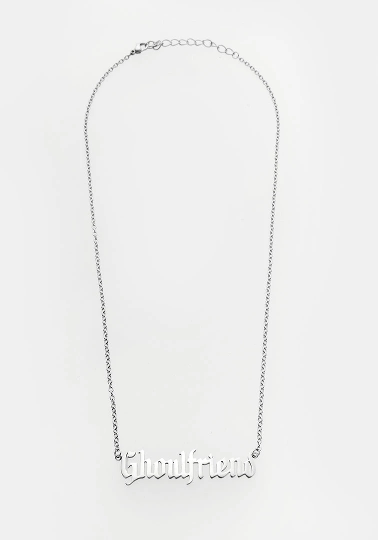 ❥ Bold gothic “Ghoulfriend” script contrasts delicate chain links