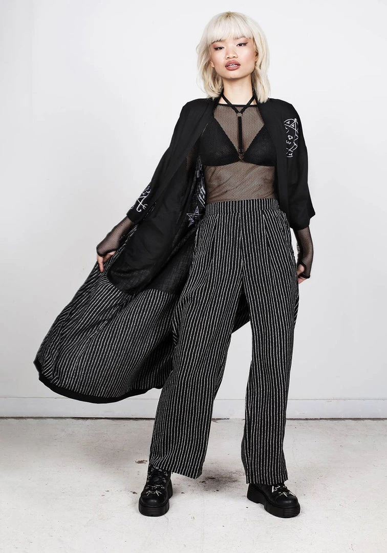 – Long black kimono-style robe with embroidered detailing