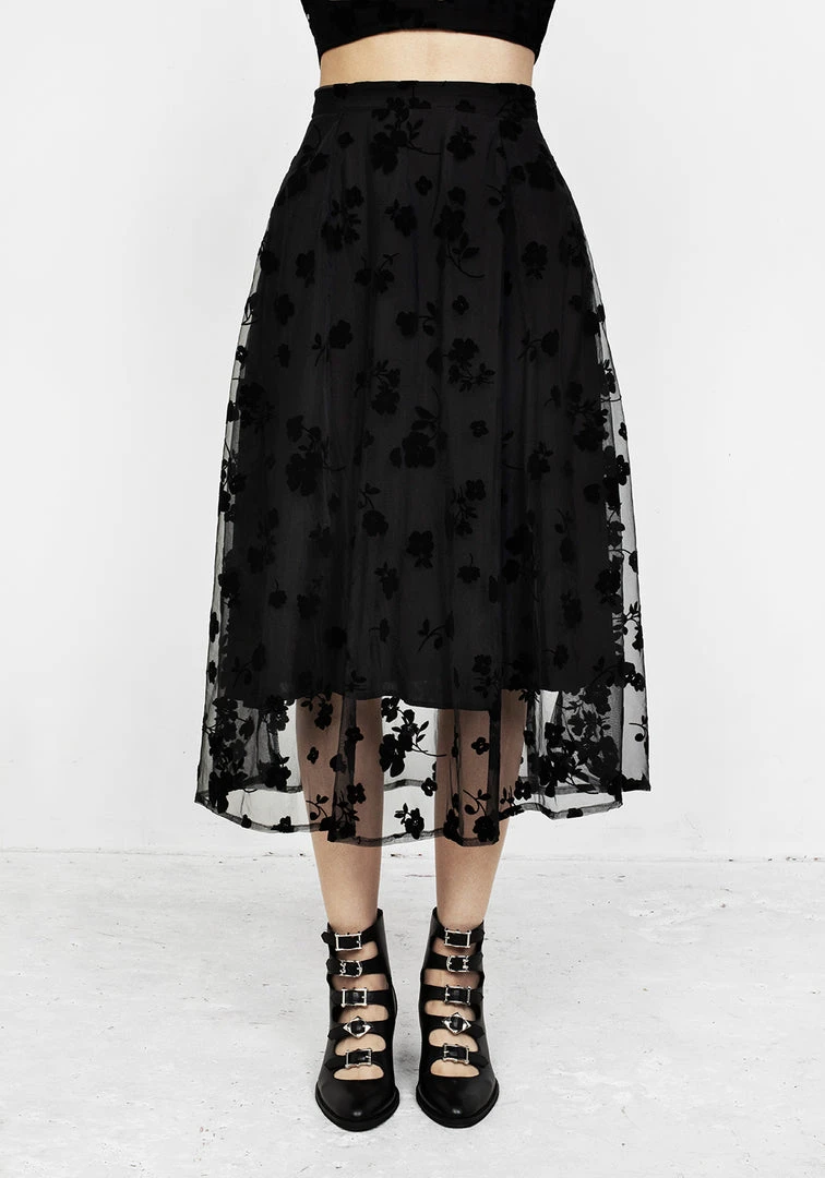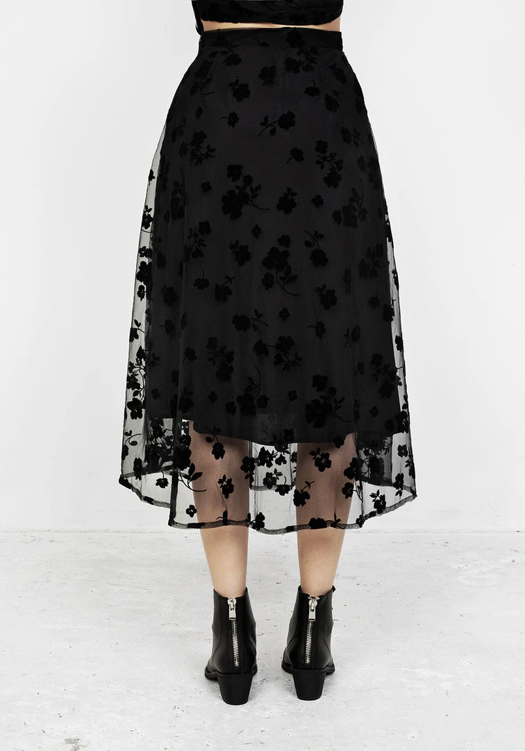 ✦ Black midi skirt with sheer overlayÂ